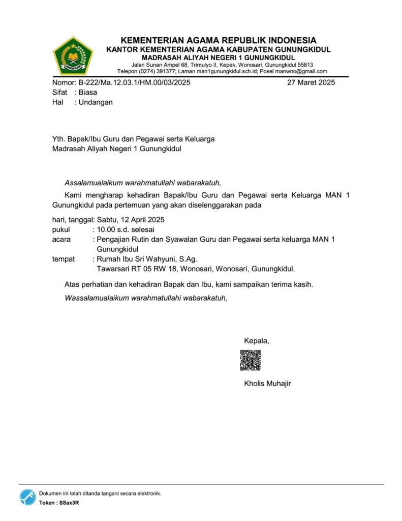 Diberitahukan kepada bapak ibu guru dan pegawai MAN 1 Gunungkidul bahwa kegiatan Syawalan Guru dan Pegawai akan dilaksanakan pada hari Sabtu, 12 April 2025. Dimohon kehadirannya.