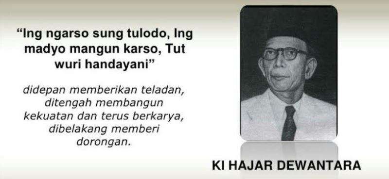 Salah satu filosofi terkenal dari Ki Hadjar Dewantara adalah filosofi yang kini menjadi landasan pendidikan di Indonesia dan juga menjadi semboyan Kementerian Pendidikan, Kebudayaan, Riset, dan Teknologi. Semboyan tersebut adalah “Ing ngarsa sung tuladha, ing madya mangun karsa, tut wuri handayani”. Semboyan Pendidikan Ki Hadjar Dewantara ini memiliki arti sebagai berikut: