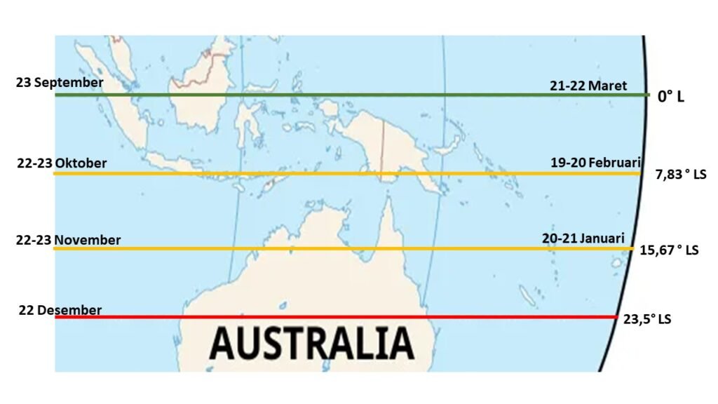 “Nah, pada tanggal 23 September matahari ada garis 00 katulistiwa, lalu bergerak menuju selatan selama 90 hari dan pada sekitar tanggal 22 Desember berada di garis 23,50 LS. Artinya dalam perjalanan menuju garis balik selatan matahari ada di garis 7,8330 LS pada hari ke 30, lalu pada hari ke-60 berada di 15,6670 LS. Jika pergerakan dimulai pada tanggal 23 September, maka pada tanggal berapa saja matahari ada di dua garis lintang tersebut?” tanyaku.