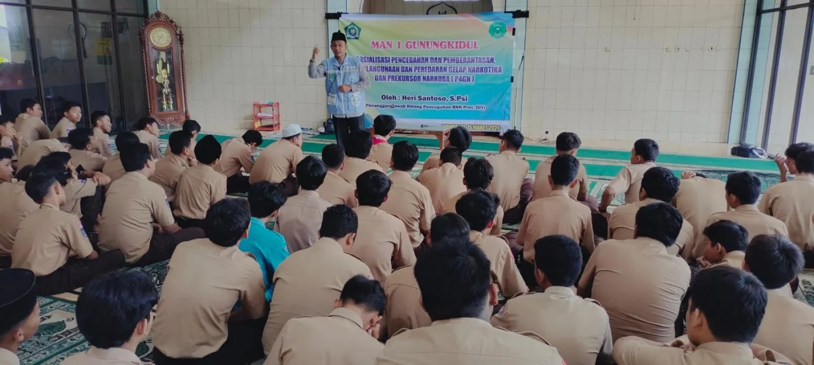 Wonosari (MAN 1 Gunungkidul)- Badan Narkotika Nasional (BNN) DIY menyosialisasikan Pencegahan dan Pemberantasan Penyalahgunaan dan Peredaran Gelap Narkotika dan Prekursor Narkoba (P4GN) untuk siswa-siswi  MAN 1 Gunungkidul. Kegiatan ini dilaksanakan di Masjid Al Hidayah pada hari Jumat (15/03/2024). Peserta sosialisasi adalah siswa-siswi kelas X,XI,XII, dan guru MAN 1 Gunungkidul.