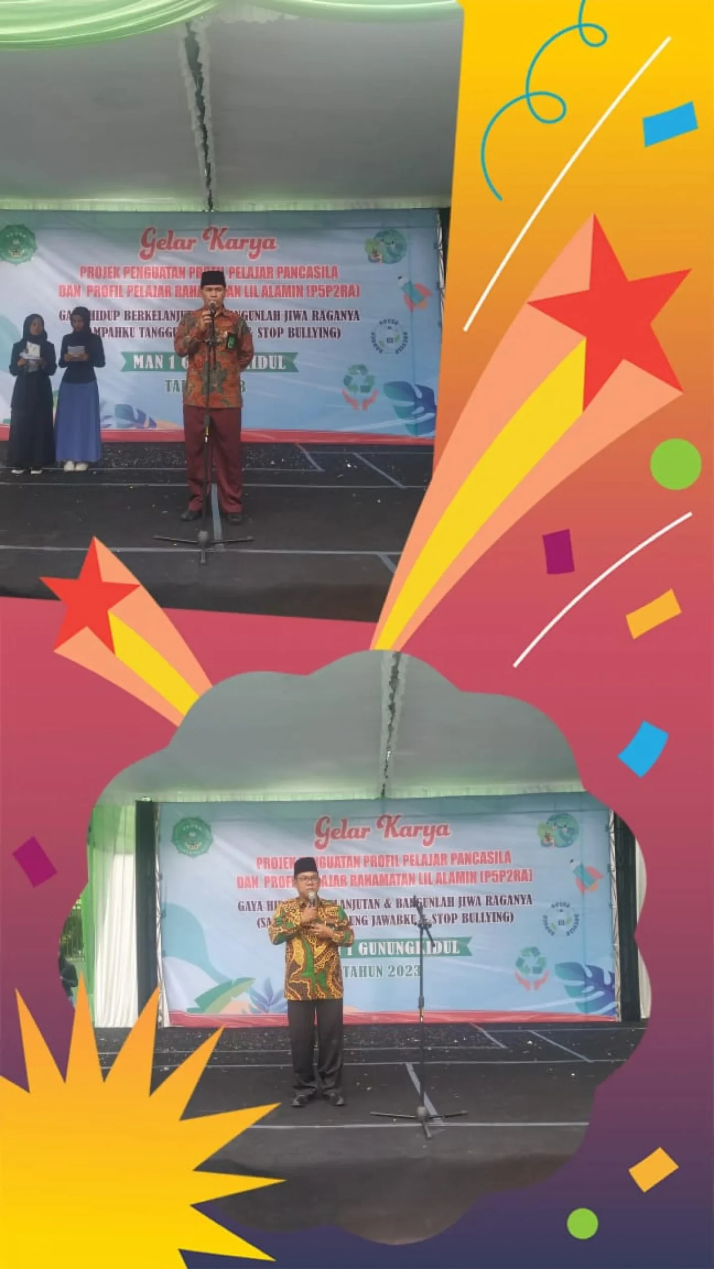 Kepala MAN 1 Gunungkidul, Kholis Muhajir, S.Pd., M.S.I. mengucapkan terima kasih kepada bapak ibu guru atas pendampingan dan bimbingan kepada peserta didik kelas X dan XI dalam proses pelaksanaan P5P2RA sehingga gelar karya Proyek Penguatan Profil Pelajar Pancasila dan Profil Pelajar Rahmatan Lil Alamin(P5P2RA) bisa terlaksana sebagai bentuk akhir terlaksananya proyek dalam tema tertentu. Proyek kelas X bertema “Gaya Hidup Berkelanjutan” dengan topik “Sampahku Tanggung Jawabku”. Proyek kelas XI bertema “Bangunlah Jiwa Raganya” dengan topik “Stop Bullying”. Manfaat kegiatan ini adalah menumbuhkan sikap saling membantu, gotong royong, dan antibulling. Hal ini juga untuk menegaskan dan memantapkan MAN 1 Gunungkidul sebagai madrasah ramah anak.