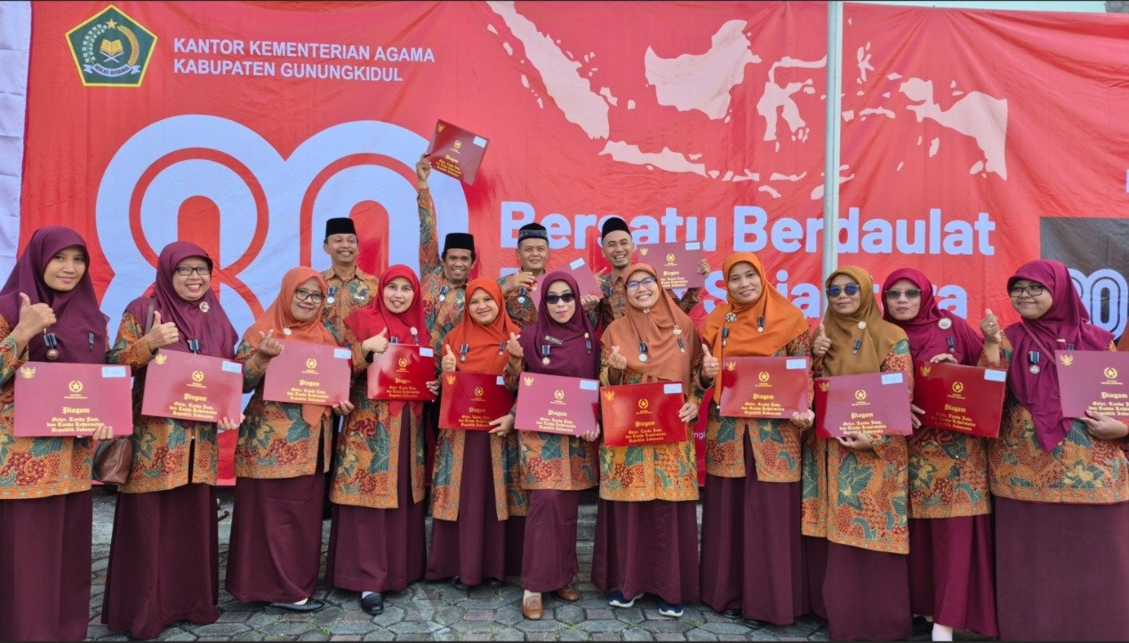 Wonosari (MAN 1 Gunungkidul) — Sebanyak 15 Guru dan Tenaga Kependidikan (GTK) MAN 1 Gunungkidul menerima penghargaan Satyalancana Karya Satya dari Presiden Republik Indonesia pada Minggu (17/8/2025). Penghargaan tersebut diberikan bersamaan dengan pelaksanaan Upacara Bendera Hari Ulang Tahun ke-80 Kemerdekaan Republik Indonesia, yang digelar di halaman Pusat Layanan Haji dan Umrah Terpadu (PLHUT) Kemenag Gunungkidul.