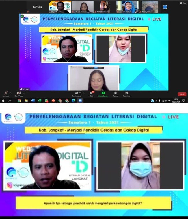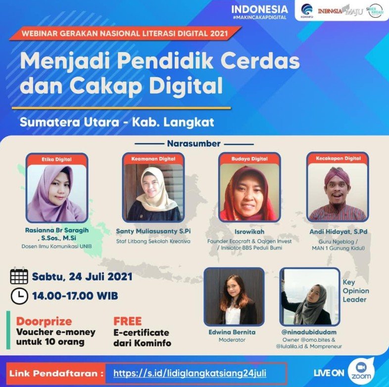 Wonosari, [25 Juli 2021] – Dedikasi guru Madrasah Aliyah Negeri (MAN) 1 Gunungkidul, Andi Hidayat, S.Pd., dalam memanfaatkan teknologi untuk edukasi kembali diakui secara nasional. Beliau diundang sebagai narasumber utama dalam webinar Gerakan Nasional Literasi Digital yang diselenggarakan oleh Dinas Komunikasi dan Informatika (Diskominfo) Kabupaten Langkat, Provinsi Sumatra Utara, dengan mengangkat tema “Menjadi Pendidik Cerdas dan Cakap Digital.”