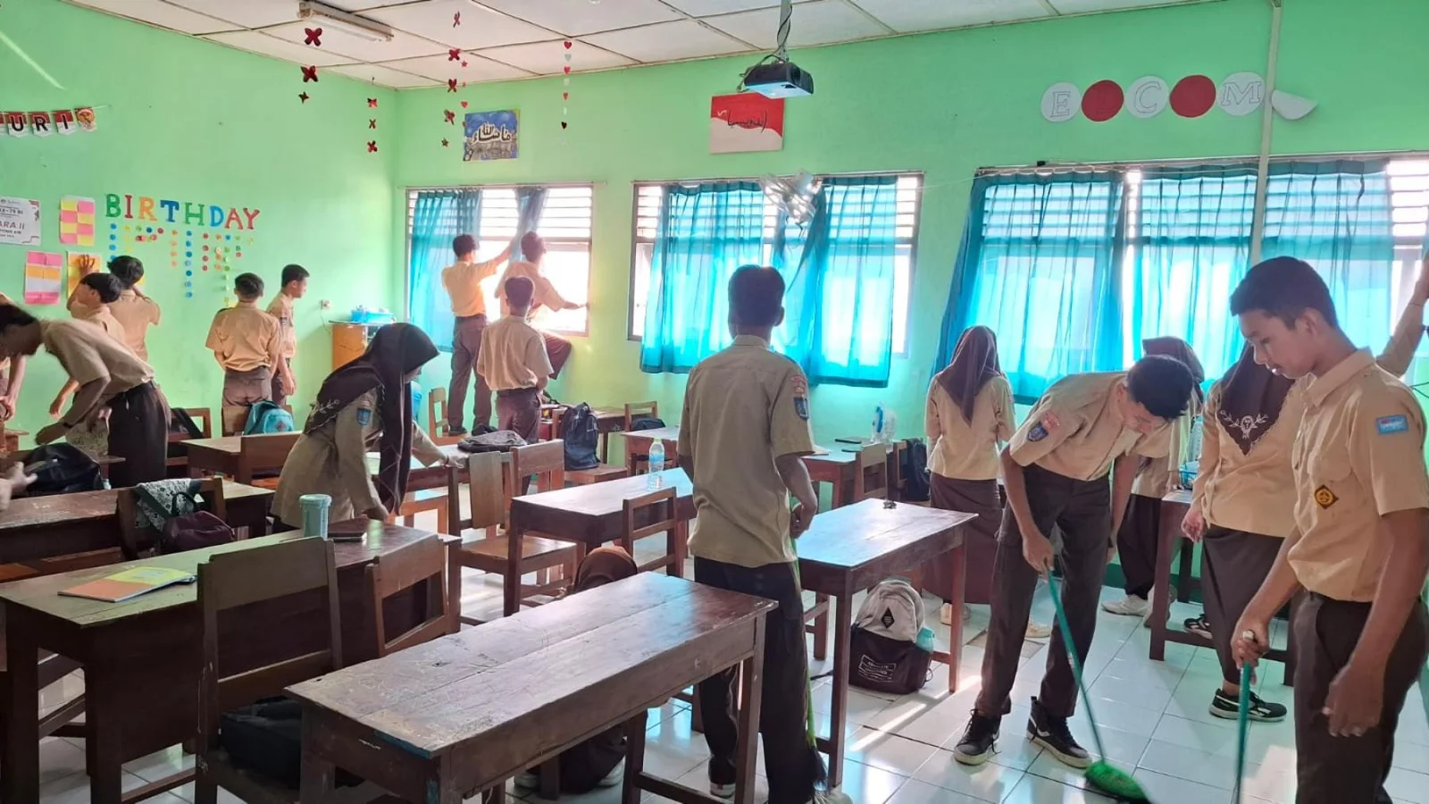 Semua siswa membersihkan kelas masing-masing dengan didampingi oleh wali kelas. Guru dan pegawai juga turut bersih-bersih di ruangan dan sekitarnya.
