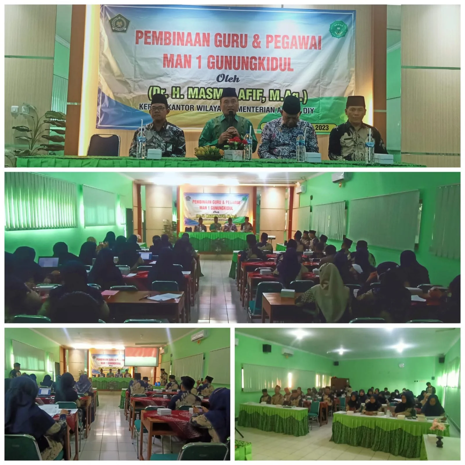 Kepala MAN 1 Gunungkidul, Kholis Muhajir, S.Ag.,M.S.I. mengucapkan terima kasih atas kehadiran Kakanwil Kemenag DIY, Dr. H. Masmin Afif,M.Ag.; Kakan Kemenag Gunungkidul , Drs. H. Sa’ban Nuroni, M.A.; Kepala Seksi Pendidikan Kemenag Gunungkidul, H. Supriyanto, S.Ag.,M.S.I.; guru, dan pegawai MAN 1 Gunungkidul. Mohon maaf atas segala yang tidak berkenan. “Terima kasih atas pembinaan yang akan disampaikaan oleh Kakanwil Kemenag DIY. Pembinaan ini akan ditindaklanjuti oleh warga madrasah,†ujarnya.