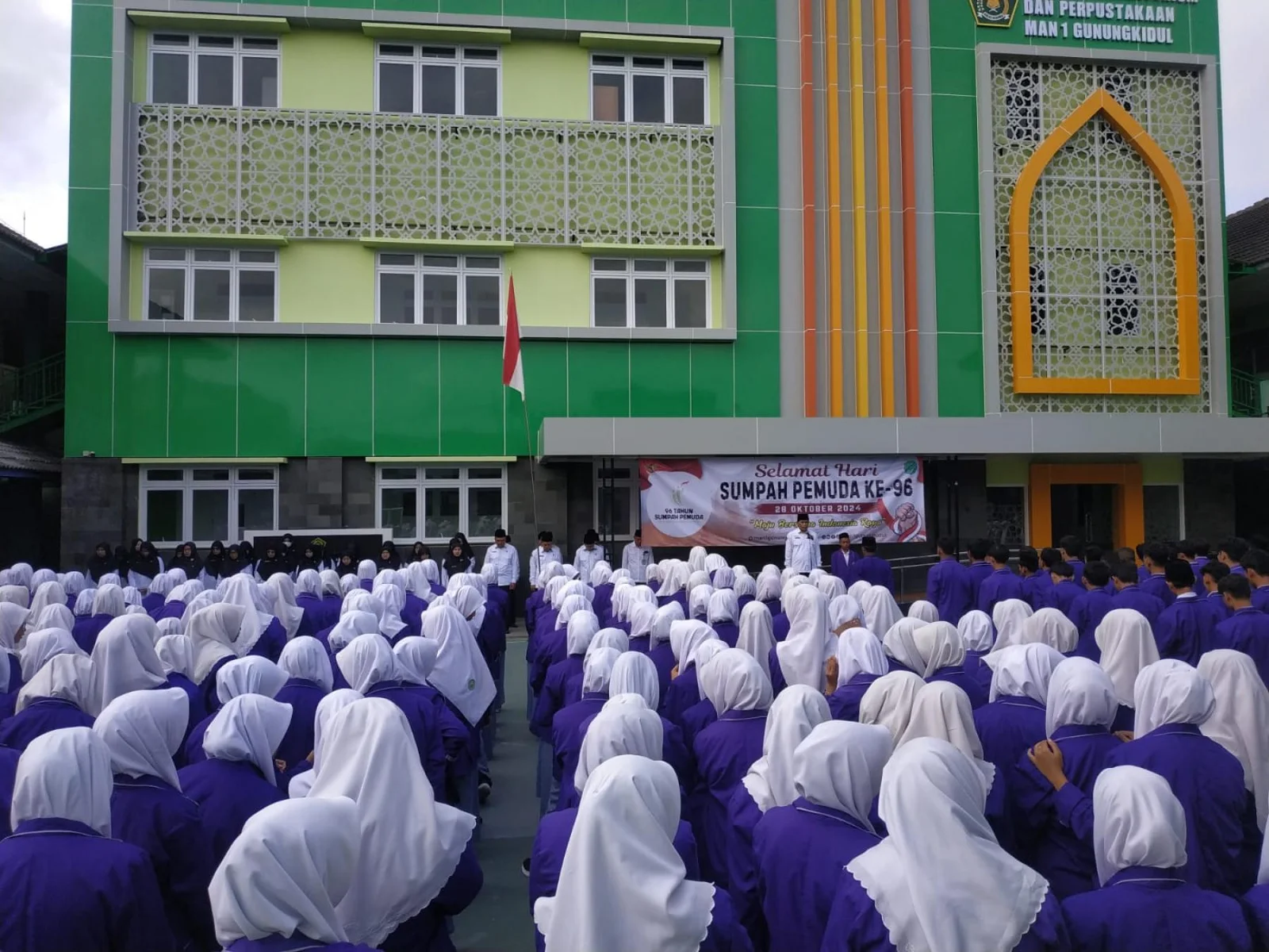 Wonosari (MAN 1 Gunungkidul) – Dalam rangka memperingati Hari Sumpah Pemuda ke-96 tahun 2024, Madrasah Aliyah Negeri (MAN) 1 Gunungkidul mengadakan upacara bendera di halaman madrasah pada hari Sabtu (28/11/2024). Upacara yang diikuti oleh seluruh siswa, guru, dan staf ini berlangsung khidmat dan penuh semangat.