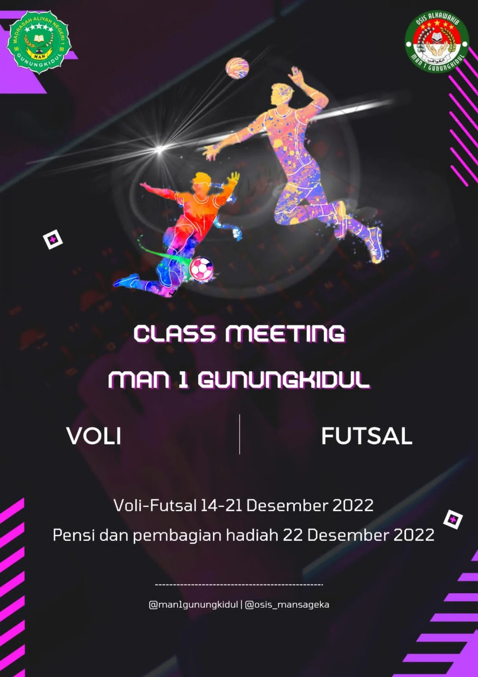 Wonosari (MAN 1 Gunungkidul) – MAN 1 Gunungkidul melaksanakan Class Meeting setelah menghadapai Penilaian Akhir Semester (PAS) Tahun Pelajaran 2022-2023 semester ganjil. Class meeting dilaksanakan tanggal 14-22 Desember 2022. Peserta Class meeting adalah perwakilan siswa kelas X, XI, dan XII.
