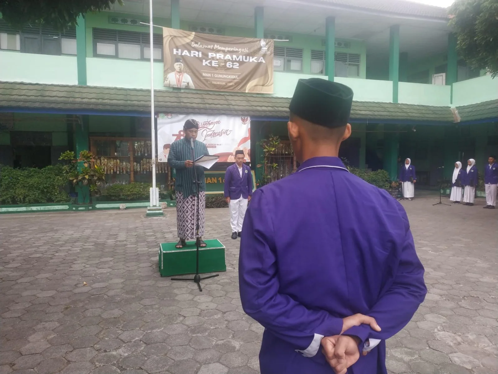 Kepala MAN 1 Gunungkidul, Kholis Muhajir, S.Ag., M.S.I. membacakan sambutan Menteri Agama Republik Indonesia. Upacara peringatan HUT RI adalah bagian dari cara bersyukur kepada Tuhan Yang Maha Esa atas anugerah kemerdekaan dan cara berterima kasih kepada para pejuang. Sebagai kementerian yang mengemban fungsi pendidikan, maka menjadi tugas Kementerian Agama untuk mampu meningkatkan kualitas SDM. Kementerian Agama juga harus berada di garda terdepan dalam menguatkan semangat toleransi dan koeksistensi untuk hidup bersama dalam Bhinneka Tunggal Ika.(thr)