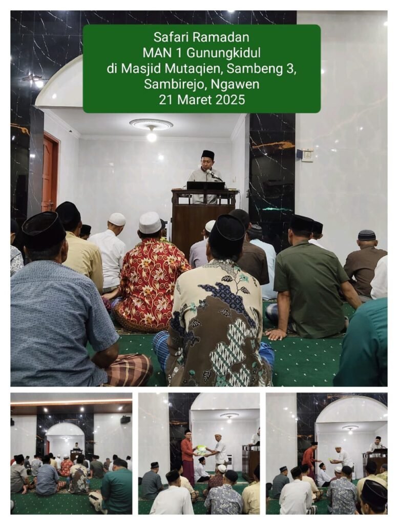 Pada hari Jum’at 21 Maret 2025 beberapa guru MAN 1 Gunungkidul melaksanakan Safari Ramadan pada dua lokasi di wilayah Gunungkidul. Rombongan pertama mengunjungi Masjid Mutaqien Dusun Sambeng 3 Sambirejo Kecamatan Ngawen Gunungkidul. Safari Ramadan ini dilaksanakan sebagai bentuk silaturahmi madrasah kepada masyarakat dan turut menyemarakkan kegiatan ibadah dalam rangka bulan Ramadan 1446 Hijriyah.