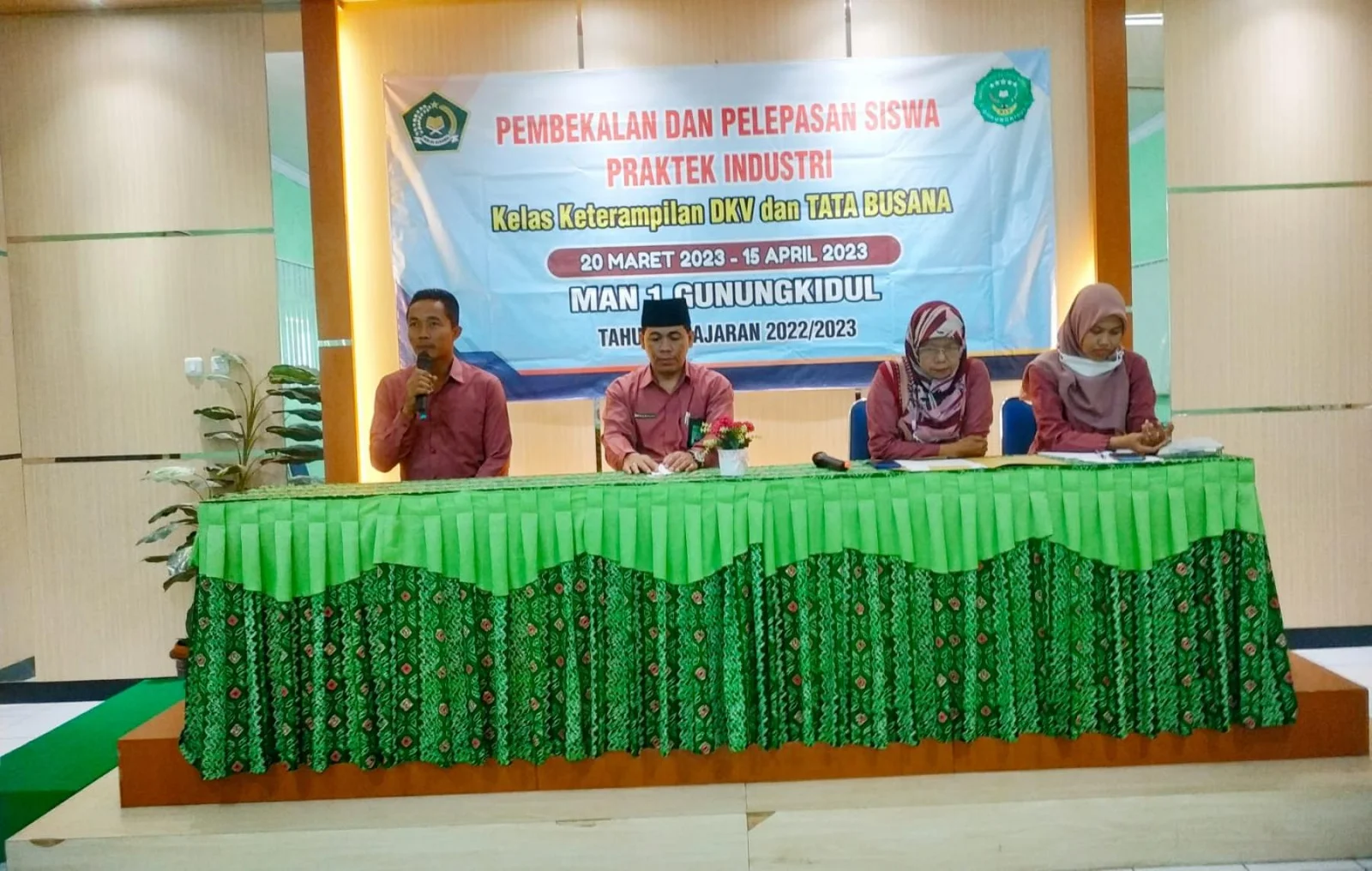 Wonosari (MAN 1 Gunungkidul) – Siswa-siswi kelas keterampilan MAN 1 Gunungkidul mengikuti pembekalan untuk melaksanakan Praktik Industri (PI). Pembekalan dan pelepasan siswa praktik industri ini dilaksanakan pada hari Sabtu (18/03/2023) di aula madrasah. PI tahun ini merupakan pertama kali dan akan menjadi pelopor sebagai MAN keterampilan.