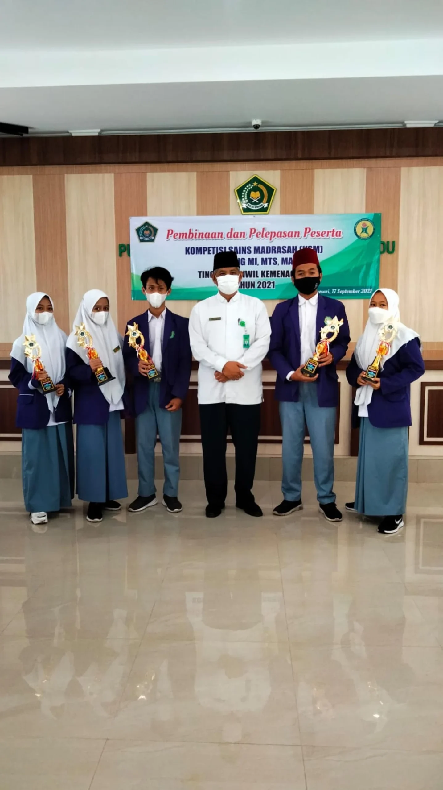 Wonosari (MAN 1 Gunungkidul) – Lima peserta Kompetisi Sains Madrasah (KSM) Tingkat Kanwil Kemenag DIY Tahun 2021 dari MAN 1 Gunungkidul menghadiri undangan pembinaan dan pelepasan peserta KSM dengan Kepala Kankemenag Gunungkidul. Acara ini dilaksanakan di Gedung PLHUT Kemenag Gunungkidul pada hari Jumat (17/9/2021).Kelima peserta KSM tersebut adalah Azmi Magisty Wibowo meraih juara I mata pelajaran Matematika terintegrasi, Melyka Anindya Pramono meraih juara I mata pelajaran Ekonomi terintegrasi, Denni Kurniawan meraih juara III mata pelajaran Kimia terintegrasi, Muhammad Fa’izul Afif Adi Pratama meraih juara III mata pelajaran Fisika terintegrasi, dan Zalzabila Fitriani meraih juara III mata pelajaran Biologi terintegrasi.