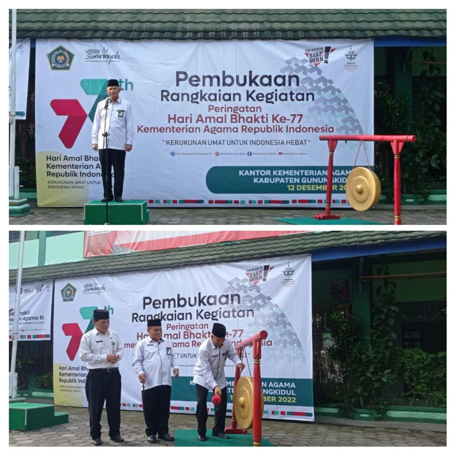 Ketua panitia kegiatan HAB kemenag ke-77, Drs. H. Andar Prasetyo, M.A. menyampaikan lima kegiatan utama HAB yaitu upacara bendera, tasyakuran dan doa serta diakhiri pegelaran wayang, bakti sosial dan ajang sana kepada mantan kakemenag Gunungkidul, mujahadah, pertandingan olah raga dan seni. Lomba-lomba yang dipertandingkan yaitu bola voli, badminton, tenis meja, paduan suara, lomba memasak, lomba PTSP dan kebersihan , video antigrativikasi, dan karaoke. Peserta lomba merupakan utusan kafilah dari 18 kapanewon meliputi KUA, madrasah, penyuluh, pondok pesantern, bawah atap, dan guru agama se-Gunungkidul. Kegiatan ini akan berlangsung mulai tanggal 12 Desember 2022 sampai 7 Januari 2023.