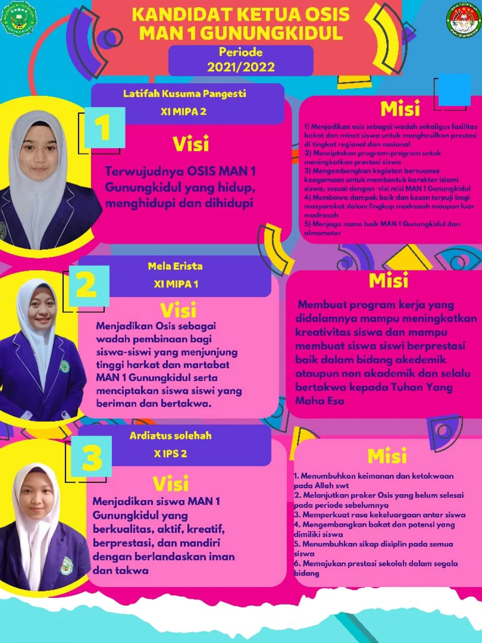 Wonosari (MAN 1 Gunungkidul) – MAN 1 Gunungkidul mengadakan pemilihan Ketua OSIS Al Kawaakib MAN 1 Gunungkidul periode 2021/2022 secara online pada hari Sabtu (18/09/2021). Ada tiga kandidat ketua OSIS periode 2021/2021 yaitu Latifah Kusuma Pangesti, siswi kelas XI MIPA 2; Mela Erista, siswi kelas XI MIPA 1; dan Ardiatus Solehah, siswi kelas X IPS 1. Pemilih adalah siswa kelas X, XI, XII, guru dan pegawai MAN 1 Gunungkidul.