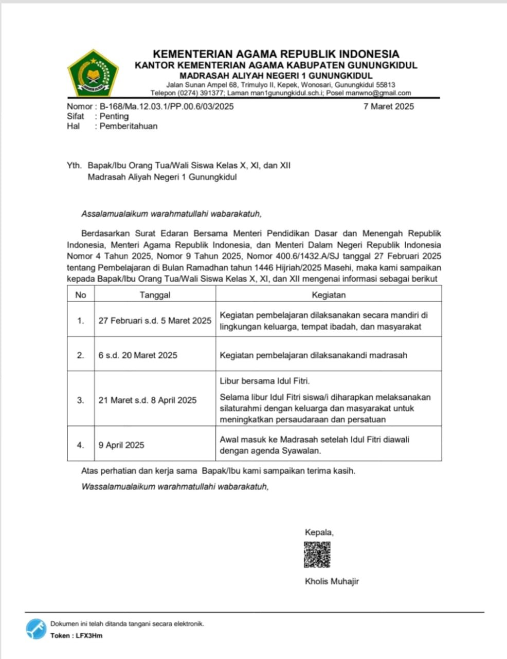 Asssalamu’alaikum wr wb. Diberitahukan kepada seluruh siswa dan orang tua/wali bahwa libur akhir Ramadan 2025 dimulai pada hari Jumat, 21 Maret 2025 – 8 April 2025. Tanggal 9 April 2025 masuk kembali ke Madrasah diawali dengan agenda syawalan. Penjelasan lebih rinci silahkan cermati pada surat Pemberitahuan di atas. Terimakasih.