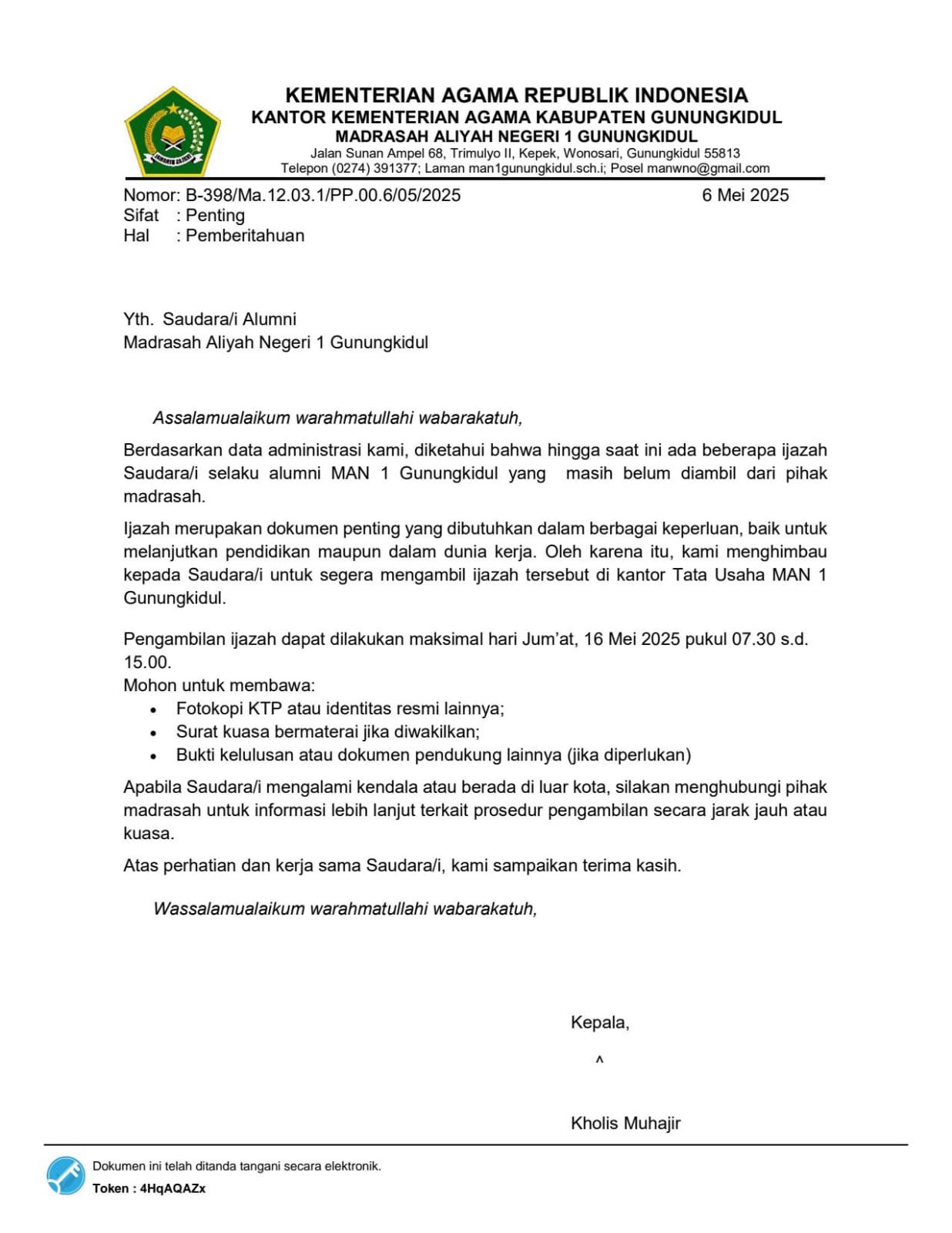 Pemberitahuan Untuk Mengambil Ijazah Bagi Alumni MAN 1 GK