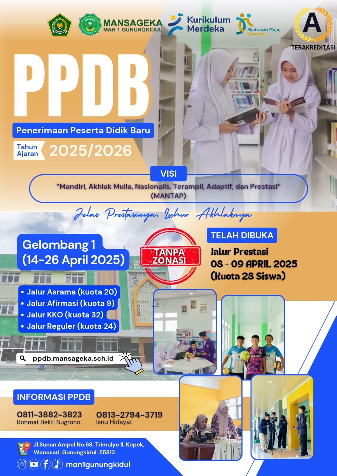 MAN 1 Gunungkidul membuka Pendaftaran Peserta Didik Baru tahun ajaran 2025-2026 Gelombang 1 mulai tanggal 14 – 25 April 2025. Jalur pendaftaran yang dibuka antara lain Jalur Asrama (20 kuota), Jalur Afirmasi (9 kuota), Jalur KKO (32 kuota) dan Jalur Reguler (24 kuota).