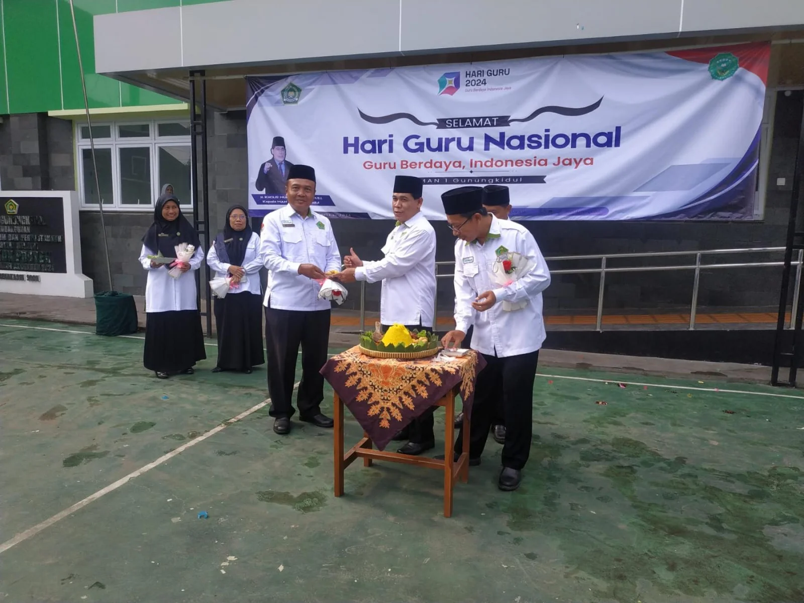 Wonosari (MAN 1 Gunungkidul) – Dalam memperingati Hari Guru Nasional (HGN) ke-53 tahun 2024, MAN 1 Gunungkidul melaksanakan potong tumpeng dan memberi penghargaan kepada GTK MAN 1 Gunungkidul. Kegiatan ini dilaksanakan setelah Upacara HGN di halaman madrasah pada hari Senin (25/22/2024).