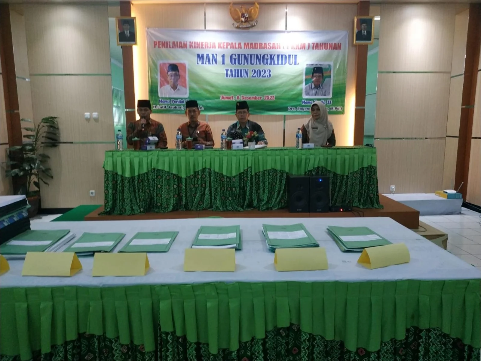 Wonosari (MAN 1 Gunungkidul)- Penilaian Kinerja Kepala Madrasah (PKKM) MAN 1 Gunungkidul dilaksanakan pada hari Jumat (8/12/2023). Guru dan pegawai MAN 1 Gunungkidul mengikuti pembukaan PKKM di aula madrasah.Kepala MAN 1 Gunungkidul, Kholis Muhajir, S.Ag., M.S.I. mengucapkan terima kasih atas kehadiran tim penilai PKKM dari Kemenag Gunungkidul Latif Jauhari, S. Ag., M.A. dan Drs. Sugeng Wibowo, M.Pd.I. sekaligus permintaan maaf jika ada kekurangan dalam penyambutan. Beliau menyampaikan presentasi kegiatan selama 1 tahun di MAN 1 Gunungkidul.(thr)
