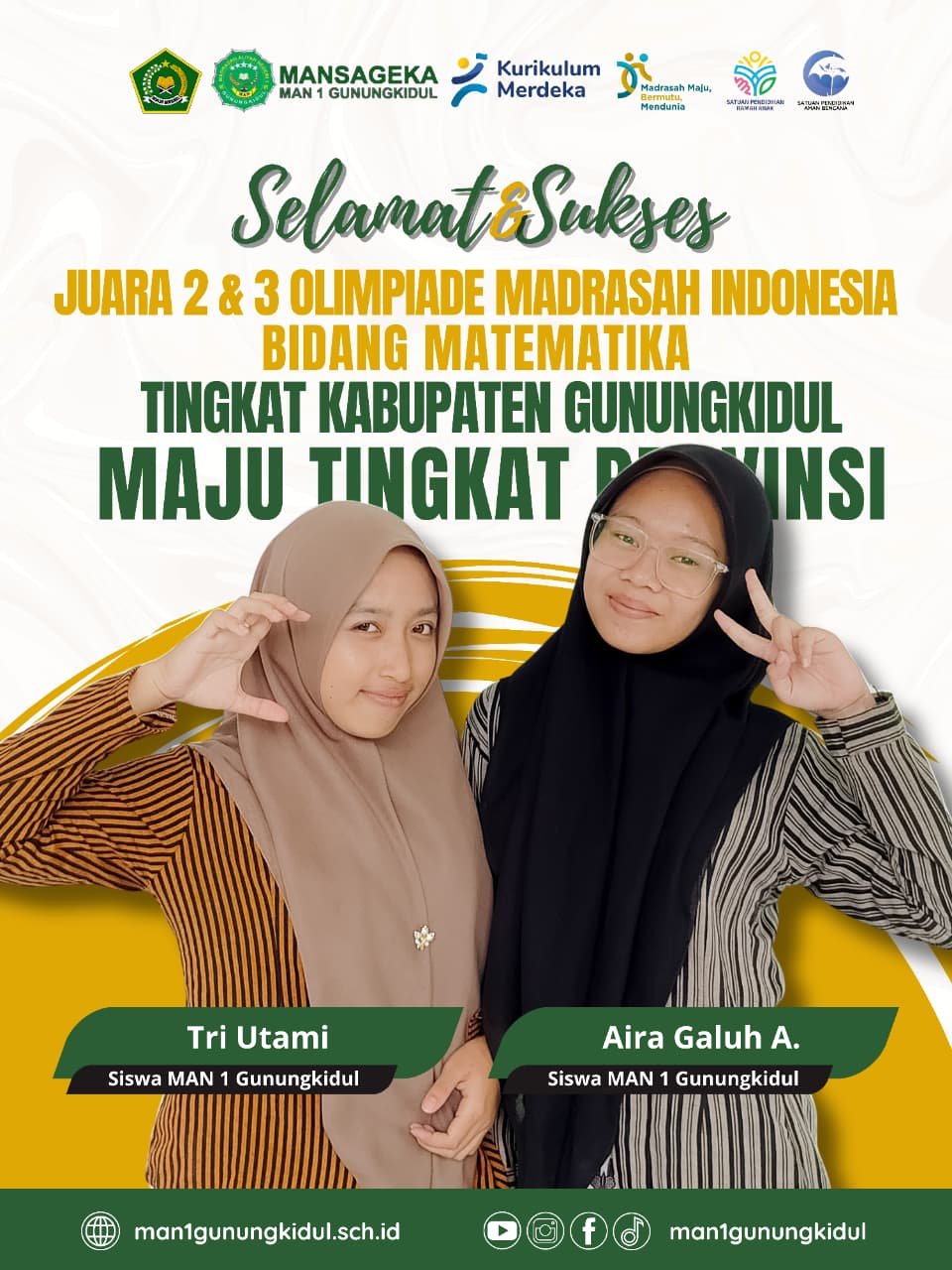 Wonosari (MAN 1 Gunungkidul) – MAN 1 Gunungkidul kembali menorehkan prestasi membanggakan melalui dua siswi terbaiknya, Tri Utami dan Aira Galuh Ayuningtyas. Ia berhasil meraih Juara 2 dan 3 dalam ajang kompetisi Olimpiade Madrasah Indonesia (OMI) untuk mata pelajaran Matematika tingkat Kabupaten Gunungkidul. Atas pencapaian ini, Tri dan Aira berhak melaju untuk mewakili kabupaten di tingkat Provinsi Daerah Istimewa Yogyakarta (DIY).