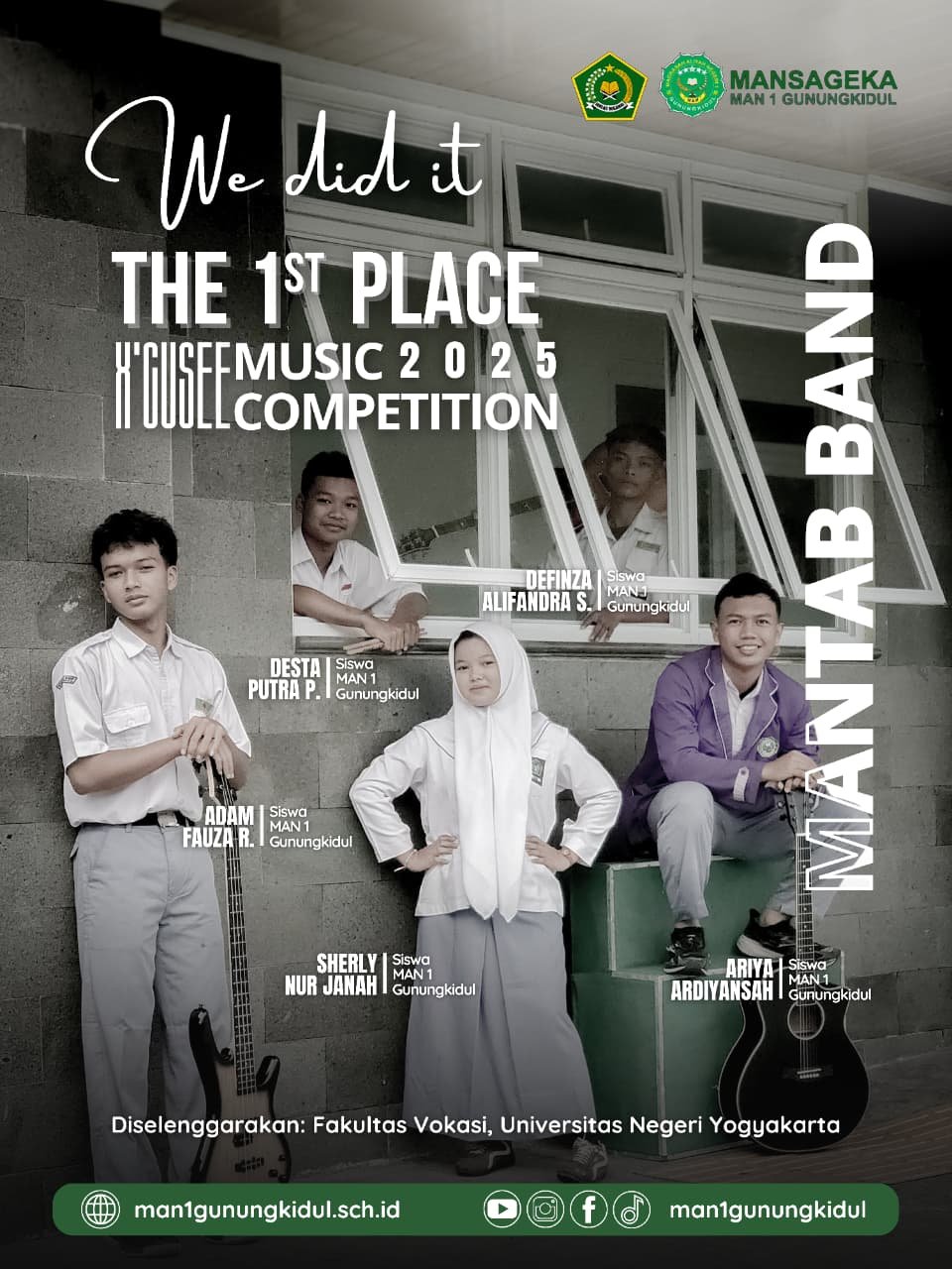 Wonosari (MAN 1 Gunungkidul) – Kelompok band Madrasah Aliyah Negeri (MAN) 1 Gunungkidul yang bernama Mantab Band berhasil menorehkan prestasi dengan meraih juara 1 dalam Excusee Music Competition. Kompetisi bergengsi yang diselenggarakan oleh Himatabona Fakultas Vokasi Universitas Negeri Yogyakarta ini digelar pada Sabtu, 15 November 2025 di Rest Area Semanu.