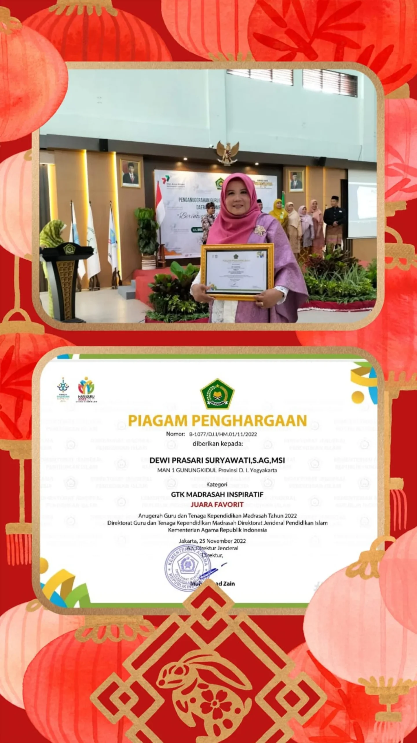 Dewi Prasari Suryawati, S. Ag., M.S.I., salah satu GTK MAN 1 Gunungkidul ini terpilih menjadi juara favorit GTK Madrasah Insipirasif Tingkat Nasional dan mendapat penghargaan dari Kantor Wilayah Kementerian Agama DIY. “Alhamdulillah,†ujarnya. “Semoga hal ini menambah motivasi pada diri sendiri untuk memberikan pelayanan kepada siswa. Selain itu juga dapat menginspirasi teman sejawat dalam meningkatkan profesionalitas,” lanjutnya.