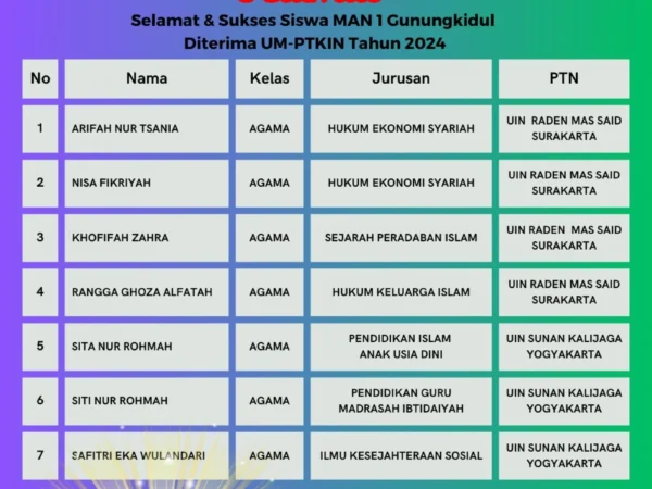 Kepala MAN 1 Gunungkidul, Kholis Muhajir, S.Ag.,M.S.I. memberi apresiasi yang tinggi kepada beliau. Semoga bisa menginspirasi dan memotivasi untuk terus berpacu dalam prestasi baik dalam bidang akademik maupun non akademik.(thr)