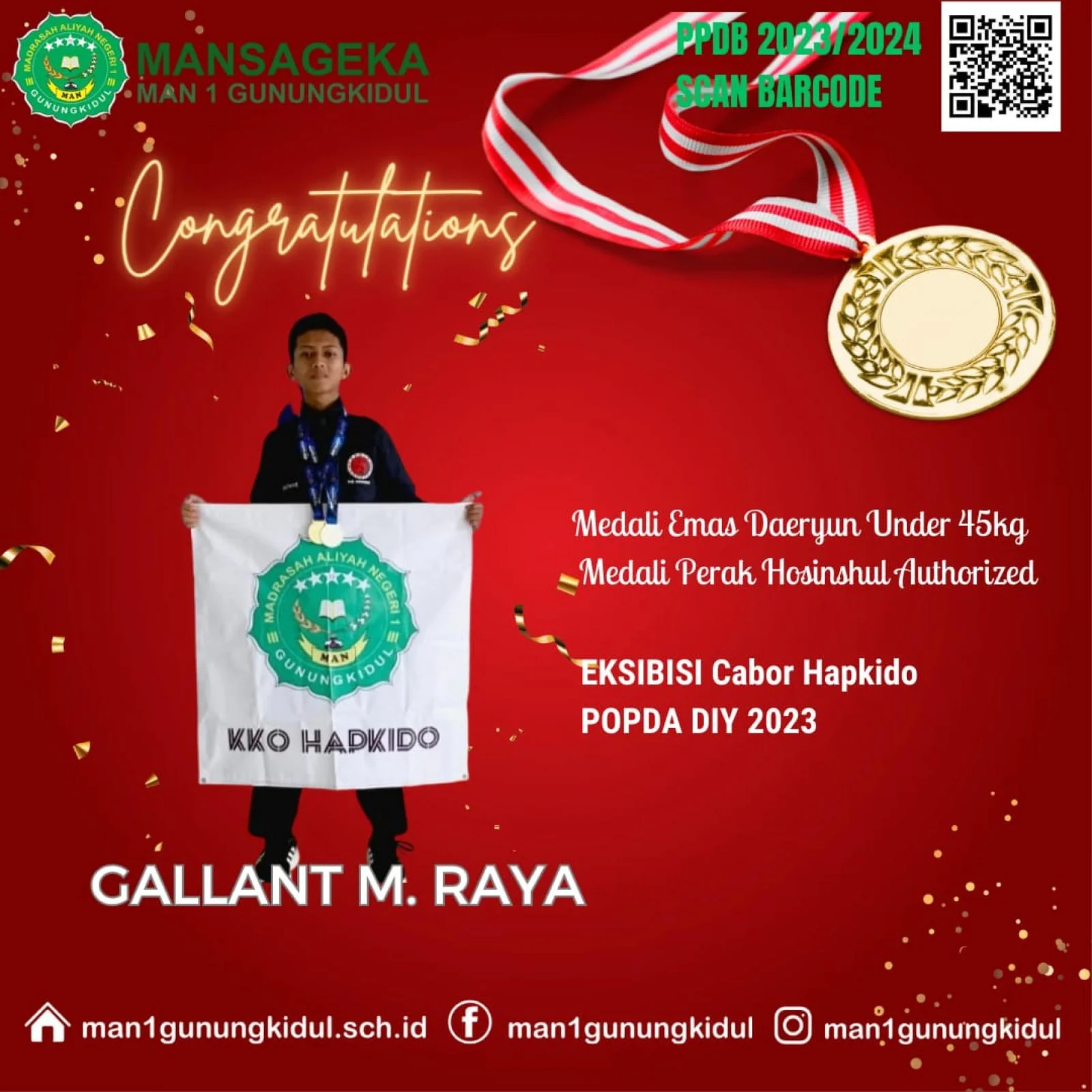 Wonosari ( MAN 1 Gunungkidul)- Siswa MAN 1 Gunungkidul, Gallant Muhammad Raya meraih prestasi gemilang di POPDA EKSIBISI Cabor Hapkido 2023. Lomba dilaksanakan di Graha Satria Bangsa Ambarbinangun Bantul pada hari Sabtu (18/03/2023).