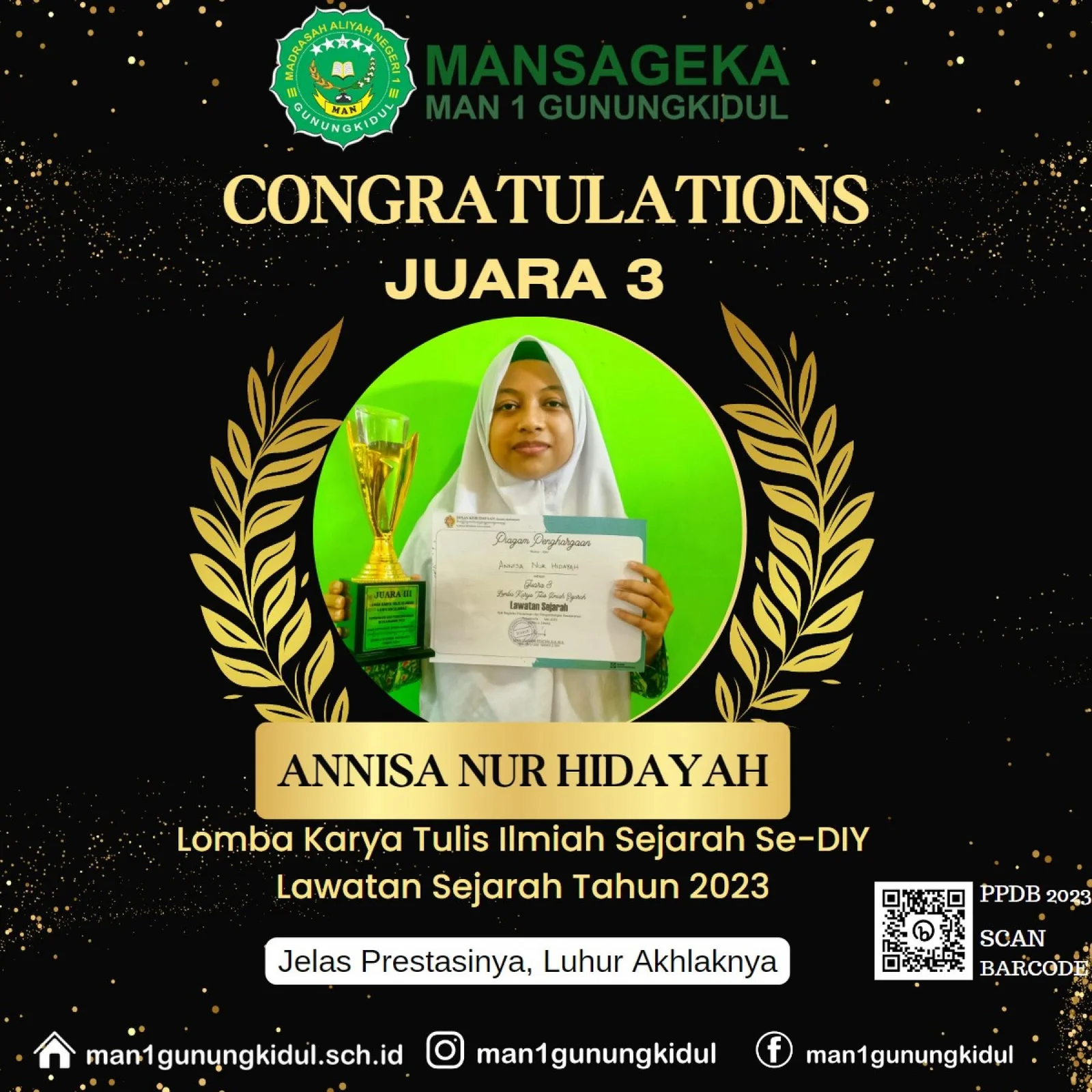 Kepala MAN 1 Gunungkidul, Kholis Muhajir, S. Ag.,M.S.I. mengucapkan selamat dan bangga kepada peserta Lawatan Sejarah, Annisa Nur Hidayah yang telah berhasil meraih juara tiga Lomba Karya Tulis Ilmiah Sejarah se-DIY. “Semoga menjadi semangat baru untuk peserta dan siswa lain untuk selalu berkarya dan berkreasi dalam meraih kesukesan. Terima kasih juga untuk pembimbing dan pendamping yang telah mendampingi peserta Lawatan Sejarah dari awal sampai akhir,†ujarnya.(thr)