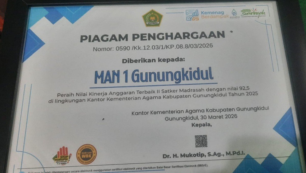 Capaian ini menjadi bukti bahwa pengelolaan keuangan di MAN 1 Gunungkidul telah berjalan dengan baik serta sesuai dengan prinsip tata kelola yang transparan dan profesional. Keberhasilan tersebut juga tidak terlepas dari kerja sama seluruh tim pengelola anggaran serta dukungan seluruh warga madrasah.