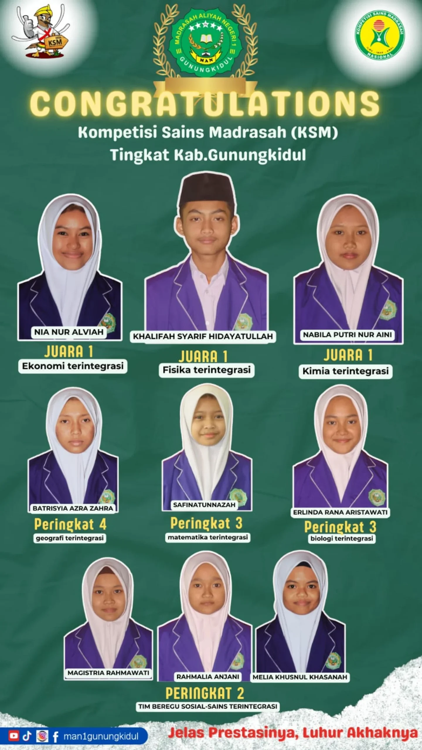 MAN 1 Gunungkidul mengirimkan 6 peserta individu untuk 6 cabang lomba dan 1 kelompok beregu. Mereka berhasil meraih prestasi yang membanggakan. Nia Nur Alviah berhasil meraih juara pertama untuk bidang Ekonomi Terintegrasi. Khalifah Syarif Hidayatullah berhasil meraih juara pertama untuk bidang Fisika Terintegrasi. Nabila Putri Nur Aini berhasil meraih juara pertama untuk bidang Kimia Terintegrasi. Safinatunnazah  berhasil meraih peringkat ketiga untuk bidang Matematika Terintegrasi. Erlinda Rana Aristawati berhasil meraih peringkat ketiga untuk bidang Biologi Terintegrasi. Batrisyia Azra Zahra berhasil meraih peringkat keempat untuk bidang Geografi Terintegrasi. Selain itu, MAN 1 Gunungkidul juga berhasil meraih peringkat  kedua untuk Tim Beregu Sosial Sains Terintegrasi. Para juara ini nantinya akan mewakili Kabupaten Gunungkidul untuk mengikuti KSM Tingkat Provinsi DIY Tahun 2024.