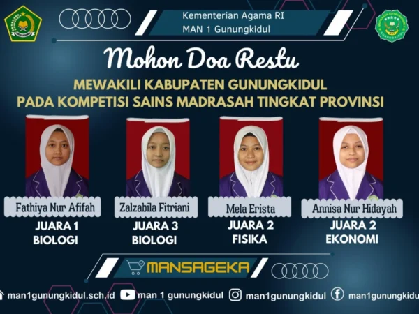 Gunungkidul (MAN 1 Gunungkidul) — Dari hasil Kompetisi Sains Madrasah Online (KSMO) tingkat provinsi yang dilaksanakan pada hari Rabu, 11 November 2020, diumumkan peringkat tiga terbaik perbidang studi, Rabu, (19/11/2020)...