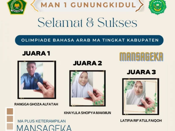 Wonosari (MAN 1 Gunungkidul) – MAN 1 Gunungkidul kembali mengukir prestasi gemilang. Tiga siswa MAN 1 Gunungkidul memborong juara Olimpiade Bahasa Arab (OBA). OBA ini diselengarakan oleh Forum MGMP Bahasa..