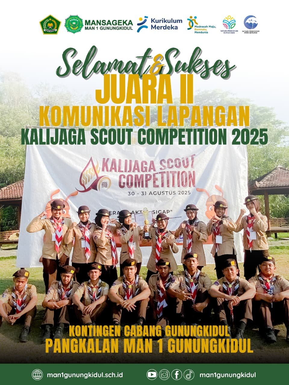 Wonosari (MAN 1 Gunungkidul) — Prestasi membanggakan kembali ditorehkan oleh Pangkalan MAN 1 Gunungkidul dalam ajang Kalijaga Scout Competition (KSC) 2025. Sebagai perwakilan dari Kontingen Kwartir Ranting (Kwarran) Gunungkidul, tim pramuka MAN 1 Gunungkidul berhasil meraih Juara 2 di Cabang Komunikasi Lapangan, mengungguli puluhan peserta lainnya dari berbagai daerah.
