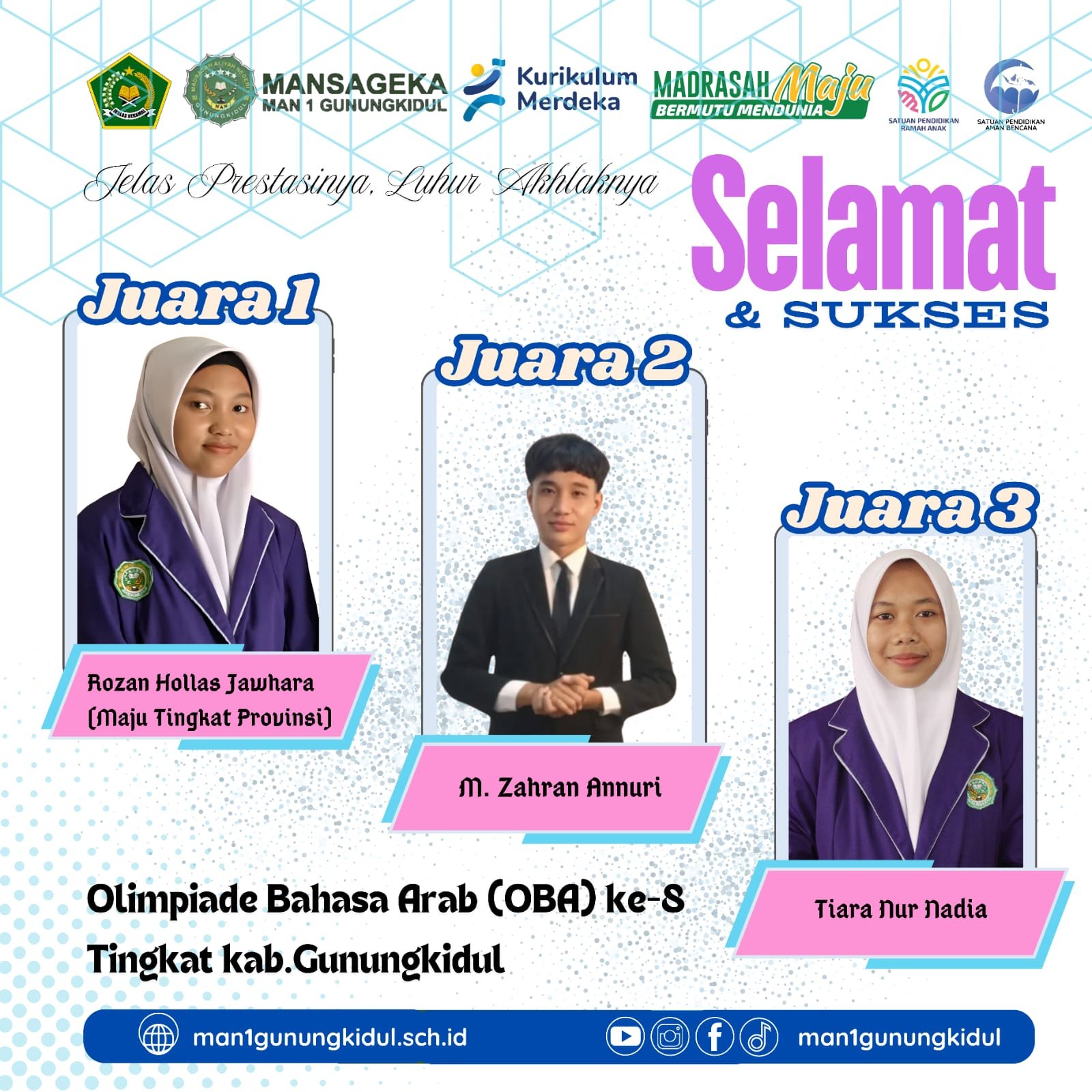 Tiga siswa MAN 1 Gunungkidul yang mengikuti Olimpiade Bahasa Arab ke-8 (OBA 8) tingkat kabupaten Gunungkidul berhasil mencatatkan prestasi pada ajang tahunan tersebut. Kegiatan tersebut dilaksanakan secara online di laboratorium komputer MAN 1 Gunungkidul. Ketiga siswa tersebut antara lain Rozan Hollas Jawhara yang meraih juara 1 dan berhak maju ke putaran berikutnya di tingkat provinsi. Juara 2 diraih oleh Muhammad Zamran Annuri dan juara 3 diraih oleh Tiara Nur Nadia.
