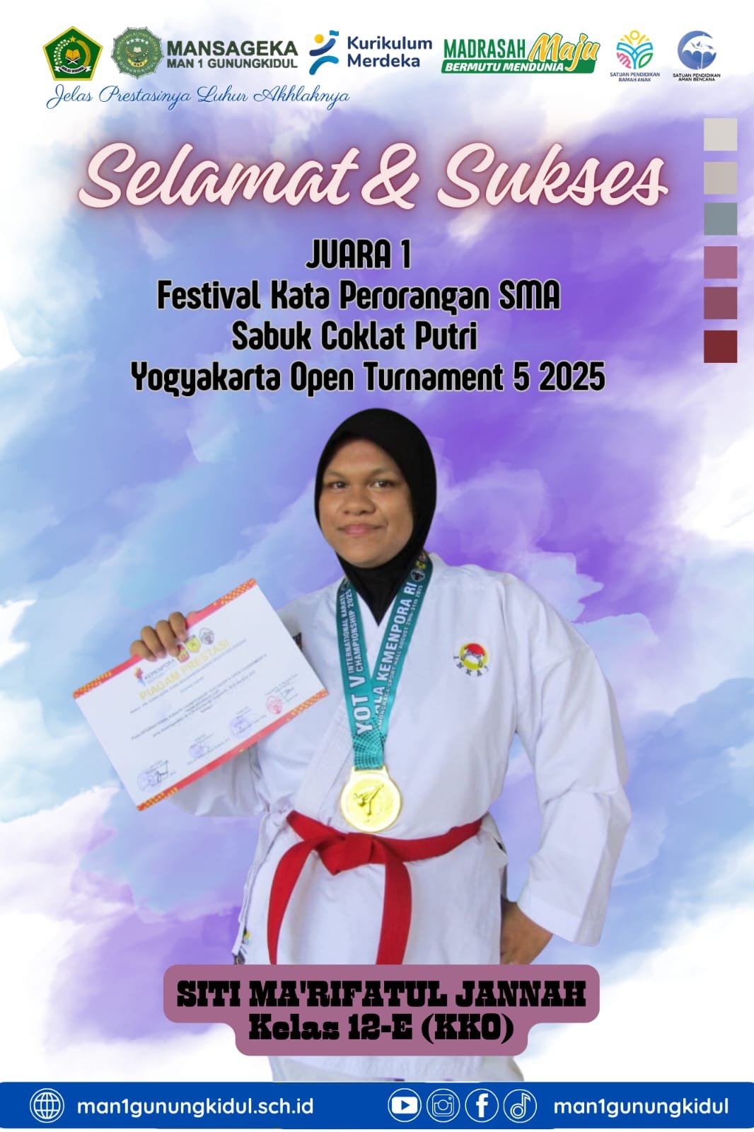 Yogyakarta (MAN 1 Gunungkidul) — Prestasi membanggakan kembali ditorehkan oleh siswa MAN 1 Gunungkidul. Siti Ma’arifatul Jannah, siswi kelas 12 E, berhasil meraih Juara I dalam ajang Yogyakarta Open Tournament 5 Tahun 2025, yang digelar hari Minggu (31/8/2025) di GOR Amongrogo, Yogyakarta.