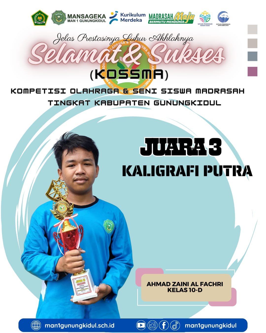 Wonosari (MAN 1 Gunungkidul) — Prestasi membanggakan kembali ditorehkan oleh siswa MAN 1 Gunungkidul dalam ajang Kompetisi Olahraga dan Seni Siswa Madrasah (KOSSMA) tingkat Kabupaten Gunungkidul tahun 2025. Siswa bernama Ahmad Zaini Al Fakhri berhasil meraih Juara 3 dalam lomba kaligrafi putra yang diselenggarakan di MAN 1 Gunungkidul pada hari Rabu (8/10/2025).