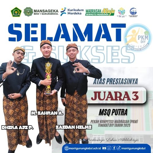 Kulon Progo (MAN 1 Gunungkidul) — Prestasi membanggakan kembali ditorehkan oleh siswa-siswa MAN 1 Gunungkidul pada ajang Pekan Kompetisi Madrasah (PKM) Tingkat DIY Tahun 2025. Dalam lomba Musabaqah Syarhil Qur’an (MSQ) Putra, tim yang beranggotakan Muhammad Zahran Annuri, Zaidan Hilmi Abdukarim, dan Dhika Aji Pratama berhasil meraih Juara 3.