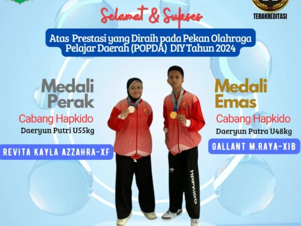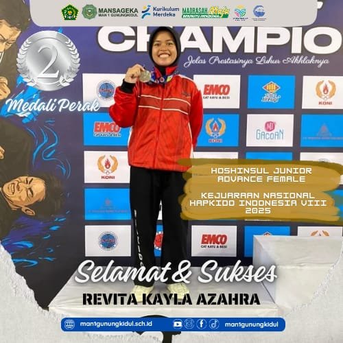 Wonosari (MAN 1 Gunungkidul) – Prestasi membanggakan kembali diraih oleh salah satu siswi MAN 1 Gunungkidul. Revita Kayla Azahra sukses meraih Juara 2 (medali perak) dalam ajang Kejuaraan Nasional (Kejurnas) Hapkido Indonesia VIII Tahun 2025 yang berlangsung di GOR CLA Kertajaya, Surabaya, Jawa Timur. Kompetisi tingkat nasional tersebut resmi berakhir pada Minggu, (26/10/2025).