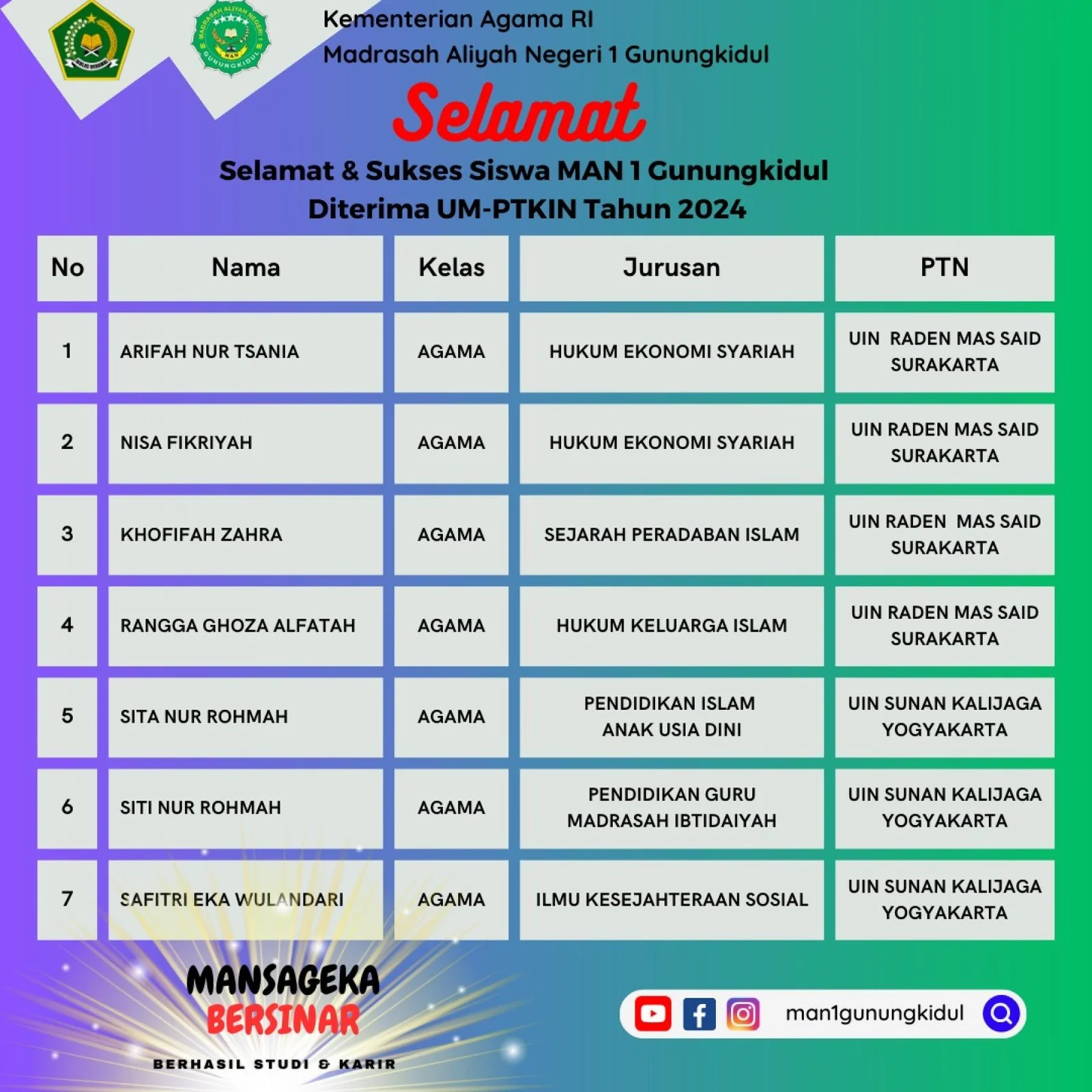 Wonosari (MAN 1 Gunungkidul) – Siswa-siswi MAN 1 Gunungkidul lolos masuk di Ujian Masuk Perguruan Tinggi Keagamaan Islam Negeri (UM PTKIN) tahun 2024. Ada 7 siswa alumni kelas agama diterima di UIN.