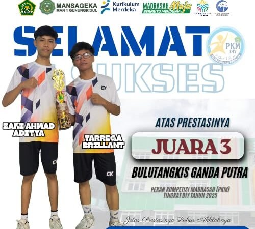 Wonosari (MAN 1 Gunungkidul) — Prestasi membanggakan kembali diraih oleh siswa MAN 1 Gunungkidul. Tim Quantum Mind yang beranggotakan Firman Wahyu Pradana, Arum Ika Wahyuni, dan Nasila Ervinda Vega berhasil meraih peringkat ke-21 dalam ajang Lomba Essay Kimia Nasional Mahasiswa dan Siswa SMA/MA Tahun 2025.