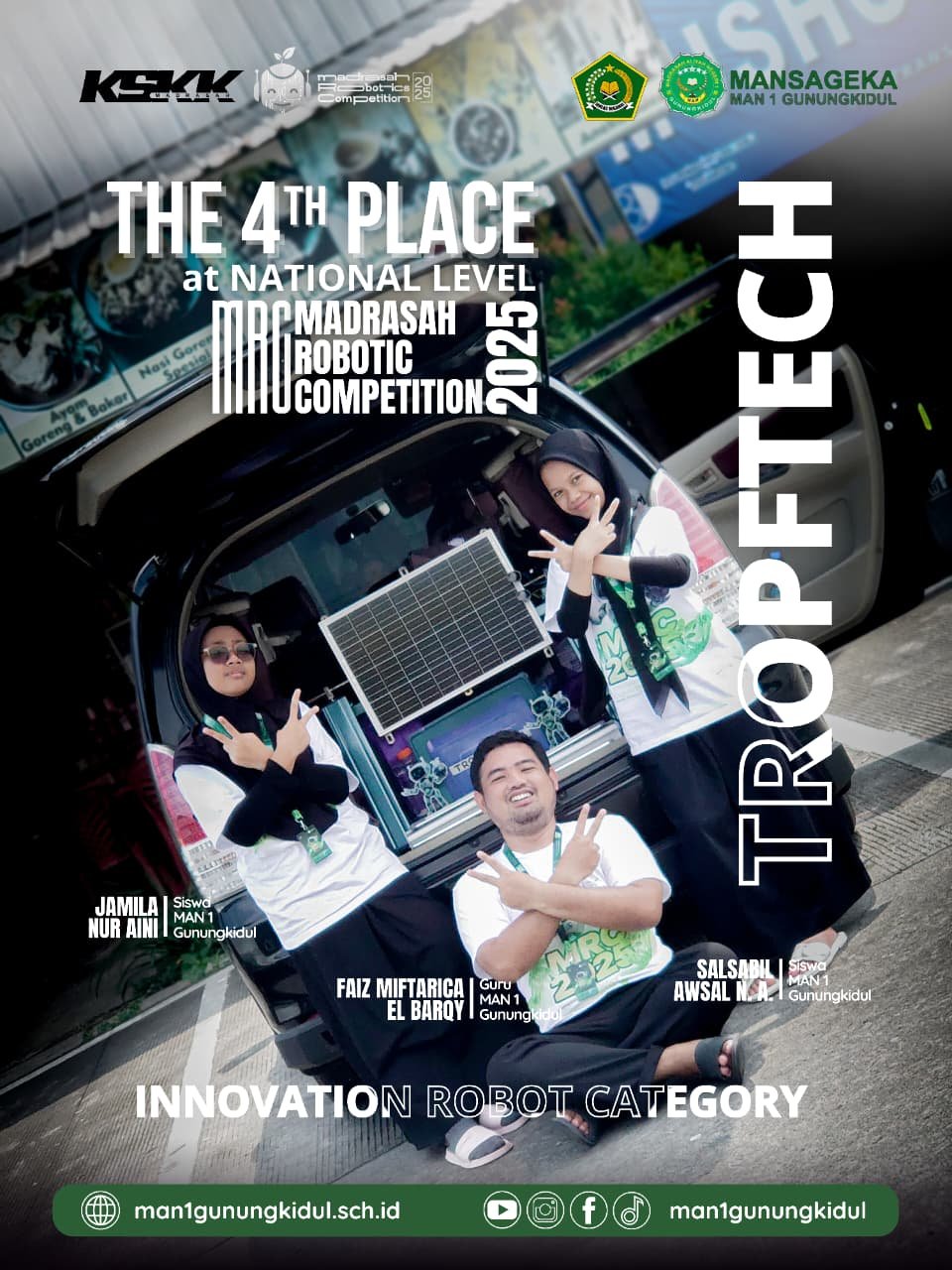 Wonosari (MAN 1 Gunungkidul) – Prestasi membanggakan kembali diraih oleh peserta didik MAN 1 Gunungkidul. Tim Robotik MAN 1 Gunungkidul yang beranggotakan Jamila Nur Aini dan Salsabil Awsal Nazwa Azzahro berhasil meraih Juara 4 Nasional dalam Kompetisi Robotik Madrasah (KRM) Tahun 2025 kategori Karya Robot Inovasi. Sebelumnya, tim ini berhasil masuk 10 besar nasional dan berhak melaju ke babak grand final tingkat nasional.