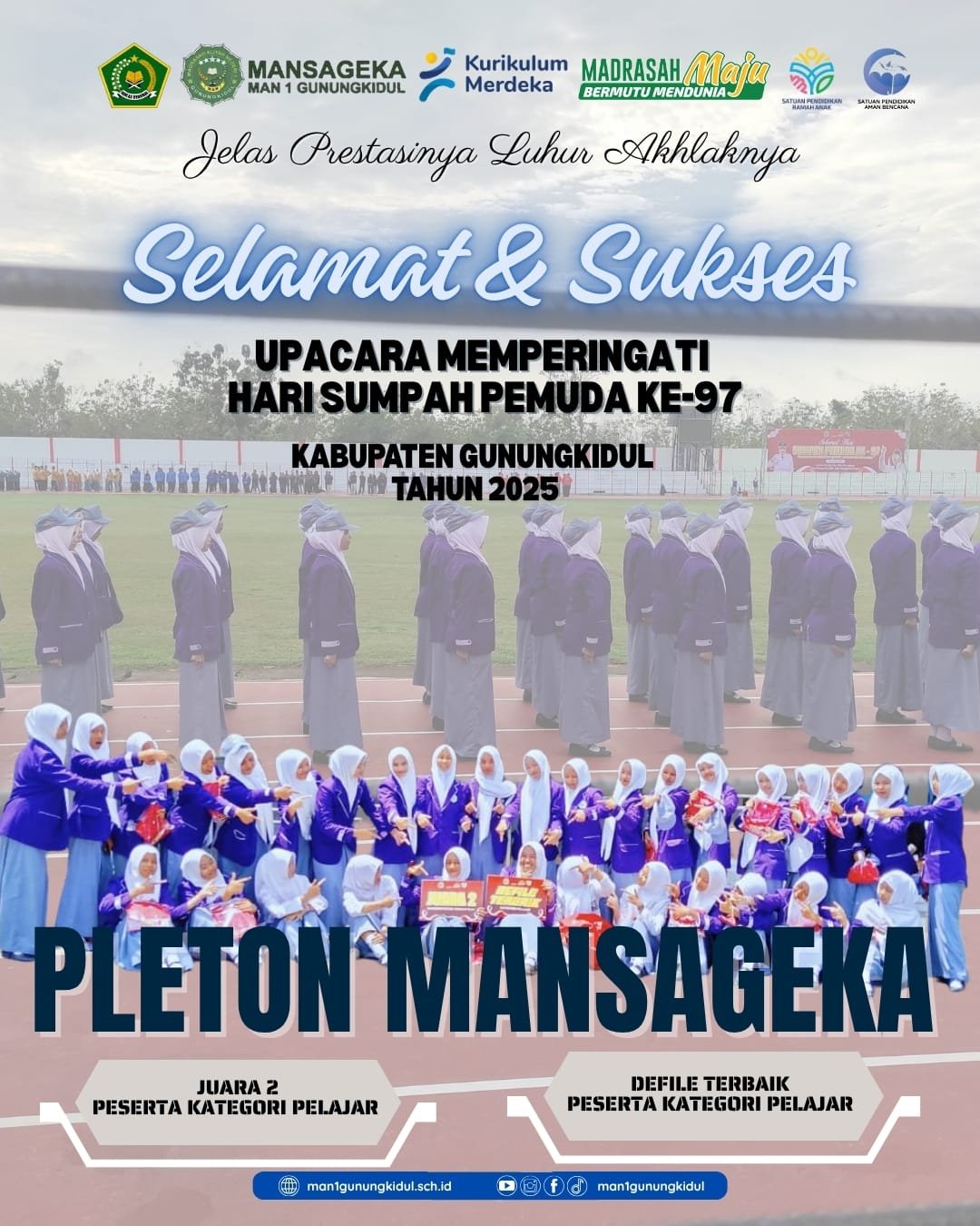 Wonosari (MAN 1 Gunungkidul) — Pasukan Tonti Askara Abhipraya dari MAN 1 Gunungkidul kembali menorehkan prestasi membanggakan. Sebanyak 31 siswa ditugaskan untuk mewakili madrasah dalam upacara peringatan Hari Sumpah Pemuda (HSP) ke-97 yang digelar di Stadion Gelora Handayani, Jeruksari, Wonosari, pada hari Selasa (28/10/2025).