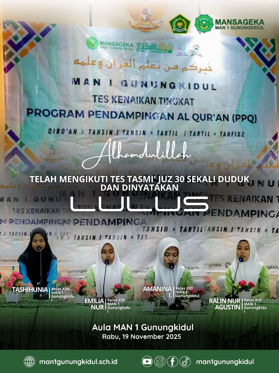 Madrasah menyampaikan apresiasi atas kerja keras para peserta dan berharap keberhasilan ini dapat memotivasi siswa lain untuk terus meningkatkan kualitas bacaan dan hafalan Al Quran. Program tahfidz MAN 1 Gunungkidul terus diperkuat sebagai upaya menumbuhkan karakter religius dan kecintaan terhadap Al Quran di kalangan peserta didik