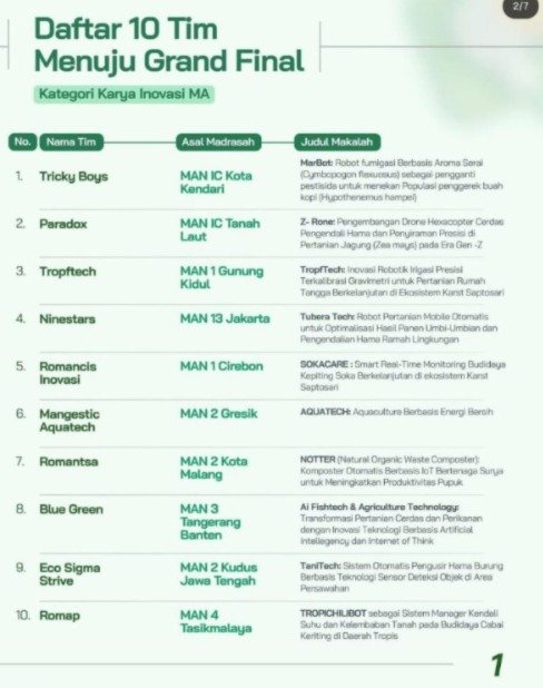 Tim yang dibimbing oleh Faiz Mitarica El Barqy ini menampilkan karya robot dengan inovasi yang menggabungkan aspek teknologi, efisiensi energi, dan kemanfaatan sosial. Judul proyeknya adalah “Tropftech Inovasi Robotik Irigasi Presisi Terkalibrasi Gravimetri untuk Pertanian Rumah Tangga Berkelanjutan di Ekosistem Karst Saptosari”. Inovasi tersebut dinilai unggul dalam kreativitas dan potensi penerapan di kehidupan sehari-hari, sehingga mampu bersaing dengan ratusan tim madrasah lainnya dari seluruh Indonesia.