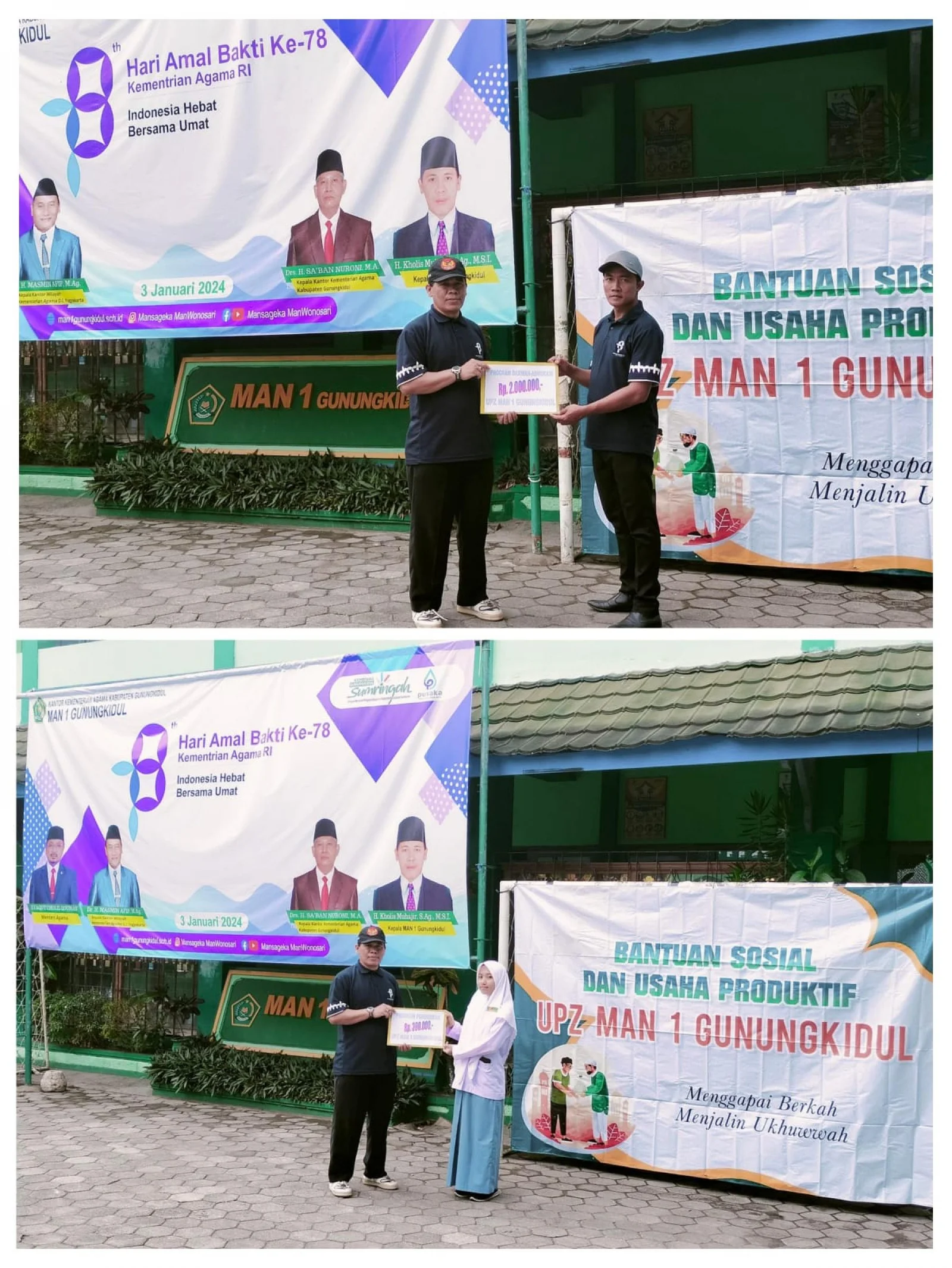 Wonosari (MAN 1 Gunungkidul)- UPZ MAN 1 Gunungkidul memberikan bantuan sosial dan usaha produksi kepada mustahiq/penerima zakat. Bantuan ini diberikan oleh Kepala MAN 1 Gunungkidul pada hari Rabu (3/01/2024) di halaman madrasah.UPZ MAN 1 Gunung kidul mengumpulkan zakat profesi Ibu Bapak Guru Pegawai yg diserahkan ke BAZNAS Gunungkidul.UPZ MAN 1 Gunungkidul menerima 70% dari zakat tersebut untuk dikelola sendiri. Ada 4 program yang dilaksanakan UPZ MAN 1 Gunungkidul yaitu Program Pendidikan,Program Advokasi Dakwah, Program Kesehatan, dan Program Kemanusiaan.Kepala MAN 1 Gunungkidul, Kholis Muhajir,S.Ag.,M.S.I. mengucapkan terima kasih kepada muzakki, terutama ASN MAN 1 Gunungkidul yang telah memberikan sebagian penghasilannya untuk orang yang berhak menerima. Semoga menambah keberkahan rezeki ASN MAN 1 Gunungkidul. Harapannya bantuan yang diberikan kepada mustahiq bermanfaat dan dapat meringankan kebutuhan pendidikan maupun keseharian.(thr)